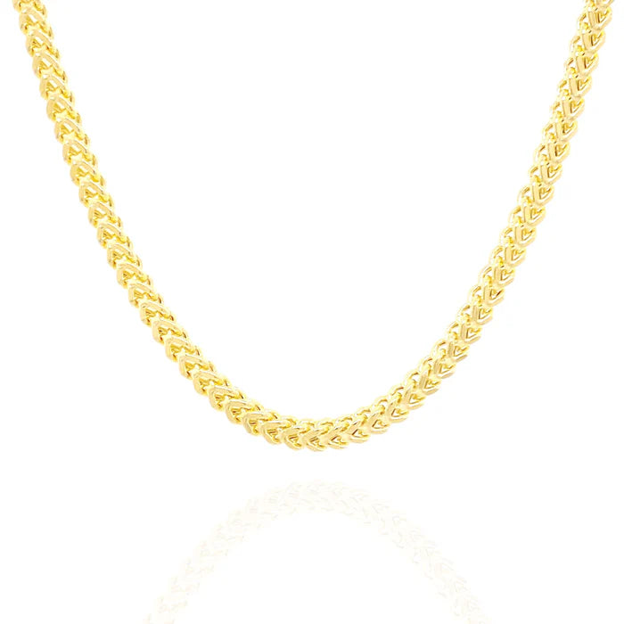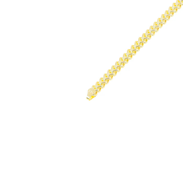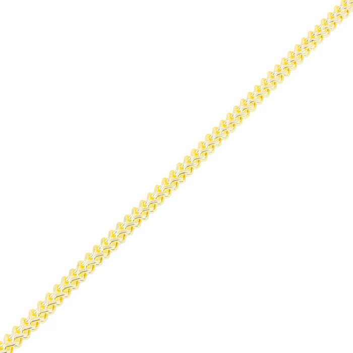 10KT Semi-Solid Square Franco Yellow Gold Chain is a luxurious Italian-made chain made of yellow gold. It is a square-shaped chain that is semi-solid, meaning that it has hallow links still made of pure 10KT gold. This makes it a perfect choice for those who want the look and feel of solid gold without the extra cost. The chain is available in a variety of lengths to fit your needs.