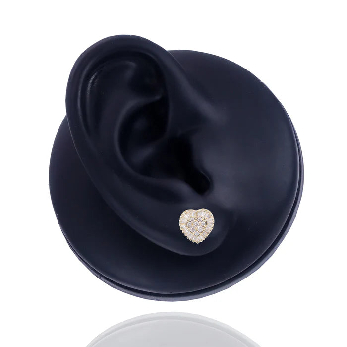 These Baguette Diamond Border Heart Earrings combine elegance and sophistication. Their heart shape cluster design showcases stunning 10KT Yellow or White Gold options, while the VS-SI Clarity Round Diamond Center with Baguette Diamond Border adds a touch of sparkle. A must-have for any jewelry collection.
