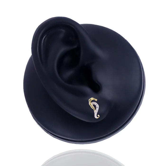 Our Seahorse Gold & Diamond Earrings are the perfect marriage of elegance and sophistication. Crafted from 14KT yellow Gold, these statement-making earrings feature one row of round, SI-I clarity diamonds for an exquisite and luxurious look. Make your style stand out with these timeless beauties.